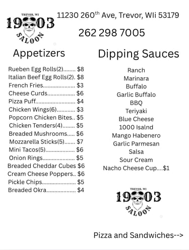 1903 Saloon is a local Trevor WI neighborhood bar & grill with friendly staff and patrons. Our garage-like atmosphere is tailored to military families and motorcycle enthusiasts.